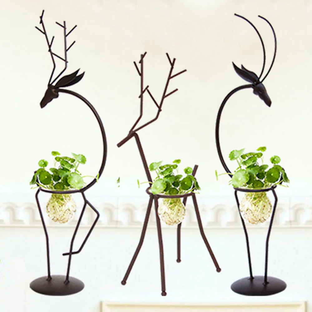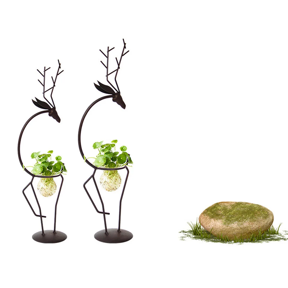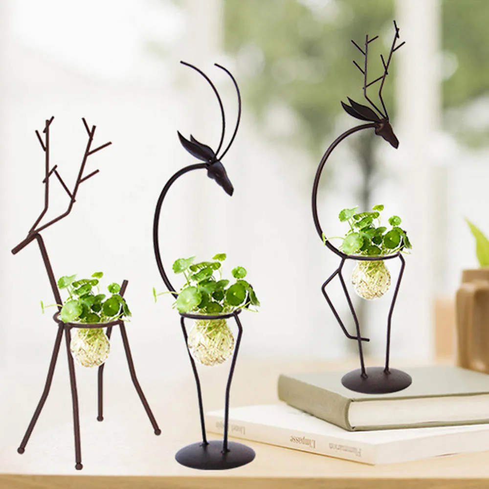Creative Hydroponic Plant Transparent Glass Vase with Iron Deer Design Stand Holder for Home Living
